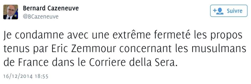 Faut-il rappeler à Bernard Cazeneuve qu’Eric Zemmour descend d’une famille juive (d’Algérie) ? S’attaquer à un Juif pour lutter contre l’antisémitisme !? La méthode est surprenante.
