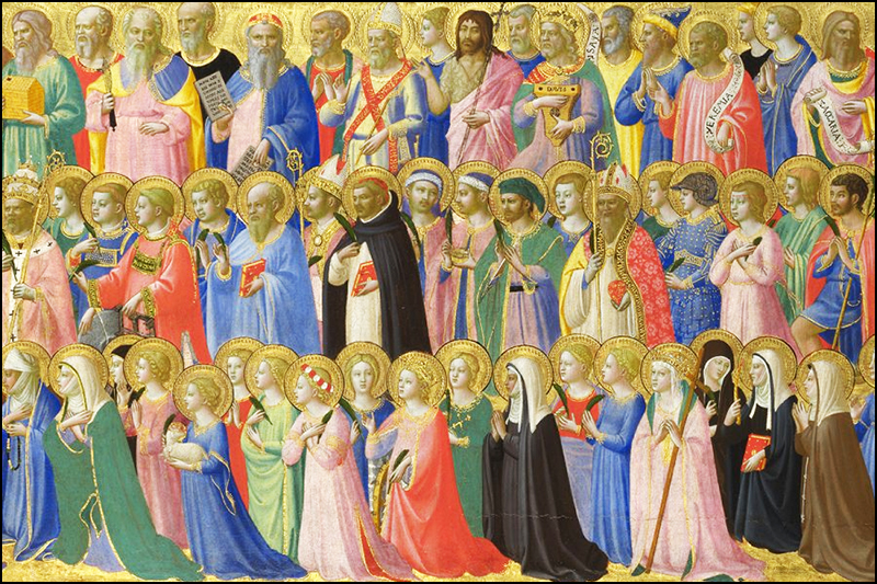 Aujourd’hui, nous célébrons la Communion des Saints, ce Mystère consolant de notre sainte Religion, pour lequel il y a une communication réciproque de Grâces entre les membres du Corps mystique, comme dans un système circulatoire spirituel qui irrigue et nourrit tous les organes avec le même sang. Grâce à cette Communion des Saints, chacune de nos prières, chaque bonne action, chaque pénitence, chaque jeûne constitue un trésor plus ou moins substantiel que nous pouvons rendre au Seigneur, en réparation de nos péchés, pour ceux d’autres vivants ou comme suffrage pour les morts. Demain, à l’occasion de la Commémoration des fidèles défunts, nous accomplirons notre profession de foi dans la Communion des Saints en consacrant les prières officielles et solennelles de l’Église pour le suffrage de nos défunts, afin qu’ils puissent rejoindre nos amis au Paradis pour jouir de la vision béatifique. Et eux, du Paradis, prient pour nous sur la terre et pour eux dans le Purgatoire. Et au Purgatoire, ils prient pour nous. Une Communion de grâces qui participe au trésor incommensurable des mérites infinis de Notre-Seigneur Jésus-Christ, acquis par Son Sacrifice rédempteur.