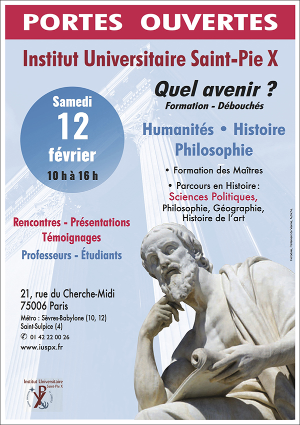 Le samedi 12 février prochain, de 10 H 00 à 16 H00, auront lieu à Paris les portes ouvertes de l’Institut Universitaire Saint-Pie X. Cet établissement, qui vient de fêter ses quarante ans, enseigne différentes disciplines telles que l’histoire et les lettres, dans un esprit catholique et français.