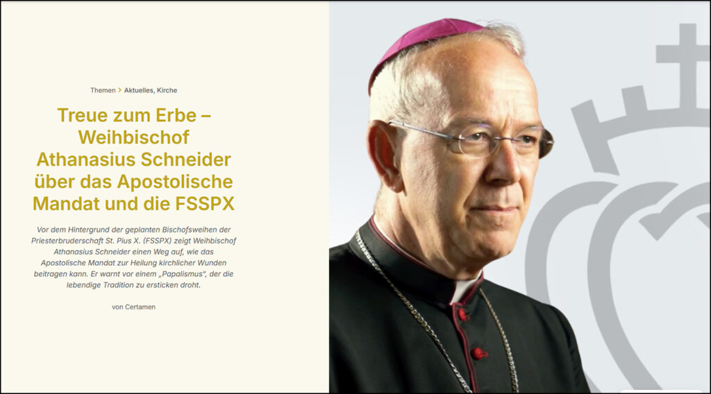 Dans un nouveau long entretien accordé à la fois à Certamen et au journaliste Michael J. Matt du site The Remnant sur leur chaîne YouTube TheRemantVideo [Voir la vidéo ci-dessous (1)], Mgr Athanasius Schneider, évêque auxiliaire d’Astana au Kazakhstan, réaffirme (2) que les consécrations épiscopales de la FSSPX ne sont absolument pas schismatiques et appelle ses confrères dans l’épiscopat à avoir un regard nouveau sur le combat mené par la FSSPX.