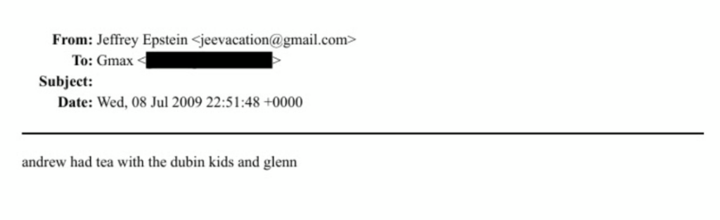 Quinze minutes plus tard, Epstein écrit à Ghislaine Maxwell : « Andrew a pris le thé avec les enfants Dubin et Glenn. »