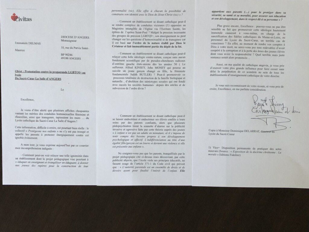 Le chef de la section Civitas Maine et Loire a adressé un courrier argumenté de protestation suite à l’exposition de propagande Lgbt au sein du Lycée du Sacré Cœur La Salle d’Angers. Er dire que certains s’imaginent encore que ce lycée est catholique…