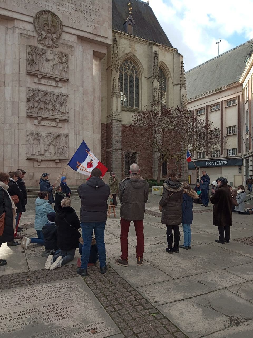 Après avoir dit que nous avions pu donner une leçon de droit au Préfet, et que le tribunal l’avait forcé à nous envoyer le récépissé, le chapelet a été récité comme d’habitude place Rihour, devant le Monument aux Morts et la chapelle du Palais Rihour. Aucun incident, pas de policiers (tous chez Zemmour), un photographe peu agréable qui nous a pris sous toutes les coutures… Christus vincit !