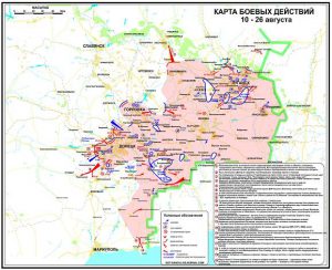 Les poches blanches sur la carte sont les dernières positions qui étaient encore tenues par des troupes de Kiev le 26 août, comme on le voit, complètement encerclées par celles de la Novorossiya. Poches que les troupes novorusses se sont depuis employées à réduire, d’où le nombre important de soldats ukrainiens prisonniers.