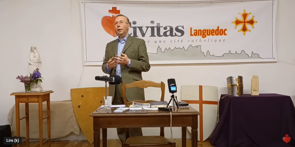 Dans le cadre des journées de formation organisées par Civitas (ici, une journée en Landuedoc le 15 avril), son président Alain Escada décrit les avancées du mondialisme et le combat qui se mène entre la Chrétienté et le Nouvel Ordre Mondial.