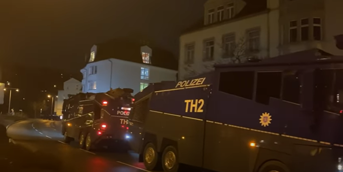 Allemagne – La ville de Greiz était encore sous haute surveillance ce week-end, comme en témoignent la photo ci-dessus des autopompes de la police venues dissuader les manifestants contre la dictature sanitaire de se rassembler. Le week-end précédent, la population locale avait bravé les interdits et les tensions avaient été importantes. Les restrictions sanitaires radicales prises en Allemagne rendent la situation explosive à l’approche des fêtes de Noël.