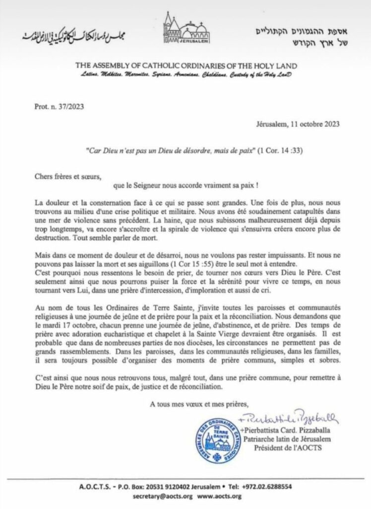Le Patriarche latin de Jérusalem rappelle l’importance de la prière. « C’est seulement ainsi que nous pourrons puiser la force et la sérénité nécessaires pour endurer ces moments difficiles, en nous tournant vers Lui, dans la prière et l’intercession, pour implorer et crier vers Dieu au milieu de cette angoisse », écrit-il.