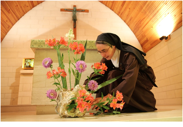 Une religieuse du Havre déposant un bouquet de fleurs dans la chapelle. – © Carmel du Havre