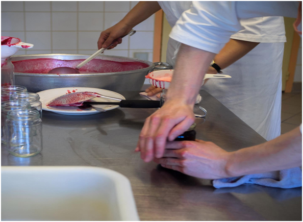 Cette dernière activité a été lancée en 1978 par les carmélites, avec comme objectif une activité économique rentable et “juste” sur bien des aspects. L’un des premiers est la fabrication des confitures (d’avril à octobre). C’est donc juste huit mois dans l’année, ce qui permet :