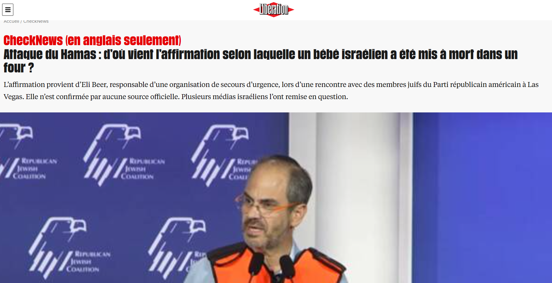 Revenons au « témoignage » d’Eli Beer le samedi 28 octobre à Las Vegas. S’exprimant devant la Republican Jewish Coalition, il affirme avoir été témoin de scènes atroces, mais ne dit pas un mot de comment il aurait pu voir cela et en sortir vivant : « J’ai vu de mes propres yeux une femme enceinte de quatre mois, elle était dans un petit kibboutz. Ils sont entrés chez elle, devant ses enfants, ils lui ont ouvert le ventre, ont sorti le bébé et ont poignardé le tout petit bébé devant elle, puis lui ont tiré dessus devant sa famille. Et puis ils ont tué le reste des enfants. J’ai vu des petits enfants qui se faisaient décapiter, on ne savait pas quelle tête appartenait à quel enfant. […] Nous avons vu un petit bébé dans un four. Ils ont mis, ces bébés dans un four et ont allumé le four. Nous avons retrouvé l’enfant quelques heures plus tard. »