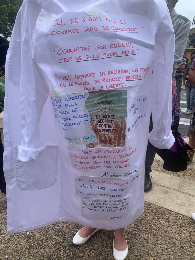 Ci-dessus, la photo de la blouse blanche d’une infirmière sur laquelle elle avait inscrit différents messages autour d’une copie agrandie de la couverture du livre de la regrettée Claire Séverac La guerre secrète contre les peuples.