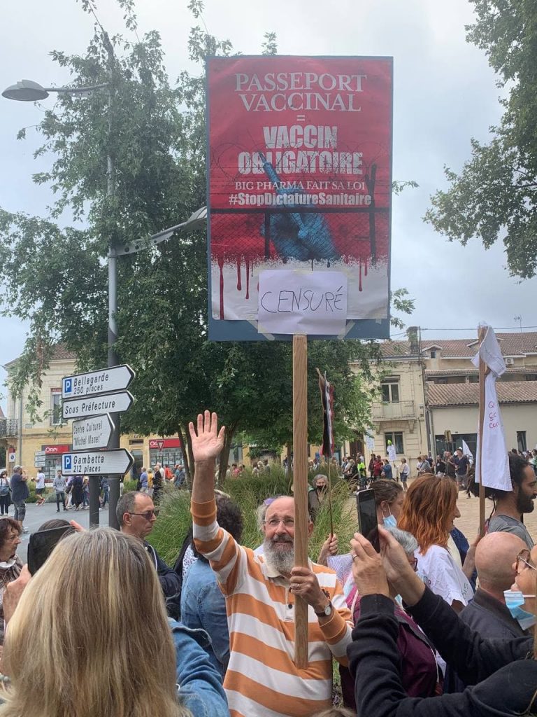La participation systématique et très visible de Civitas irrite les représentants locaux de Jean-Luc Mélenchon. NoPass24 est le comité organisateur de cette manifestation à Bergerac. Mais ce comité est en vérité dans les mains du parti de Mélenchon. NoPass24 avait donc l’intention de suivre le mot d’ordre prononcé lundi par Mélenchon : organiser des services d’ordre d’extrême gauche afin d’écarter des manifestations contre le passe sanitaire tout ce qui n’est pas assez à gauche à leurs yeux. Inutile de dire que cette tentative de récupération par Mélenchon, La France Insoumise, et les syndicats gauchistes ne plaît pas du tout aux manifestants qui prônent au contraire l’unité contre la dictature sanitaire. Civitas est donc arrivé ce matin avec des pancartes sur lesquelles le logo du mouvement était caché par le mot « Censuré ». L’effet était réussi. Collées massivement chaque semaine partout en France, les affiches de Civitas sont suffisamment connues pour que l’absence du logo ne change pas grand chose : la plupart des manifestants associent ces visuels désormais notoires au mouvement Civitas. Les organisateurs mélenchonistes ont bien tenté, au micro, de donner des consignes pour isoler les porteurs de pancartes mais la foule a hué copieusement les semeurs de zizanie au service de Mélenchon. Le capital de sympathie en faveur de Civitas en est encore sorti grandi.
