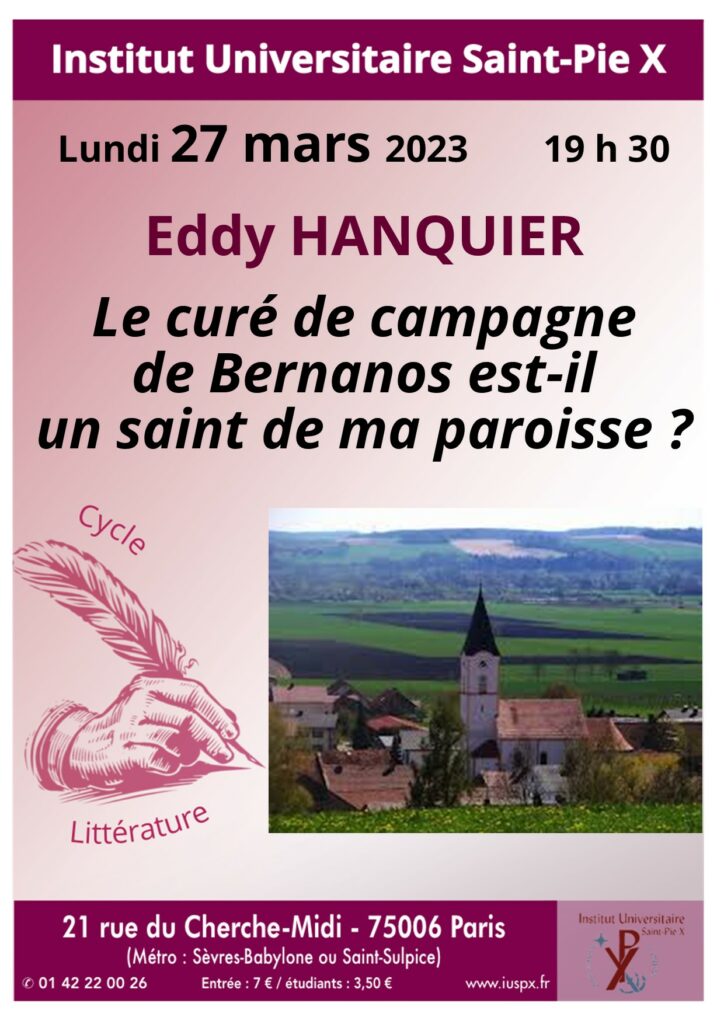 Le lundi 27 mars 2023, l’Institut Universitaire Saint Pie X, 21 rue du Cherche-Midi à Paris, accueillera une conférence sur le thème « Le curé de campagne de Bernanos est-il un saint de ma paroisse ? ».