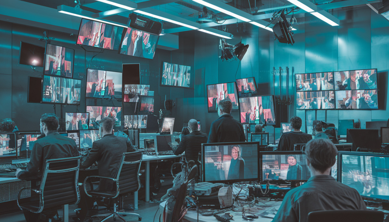 Newsroom frénétique, chaos médiatique organisé — Image de synthèse — tous droits réservés medias-presse.info
