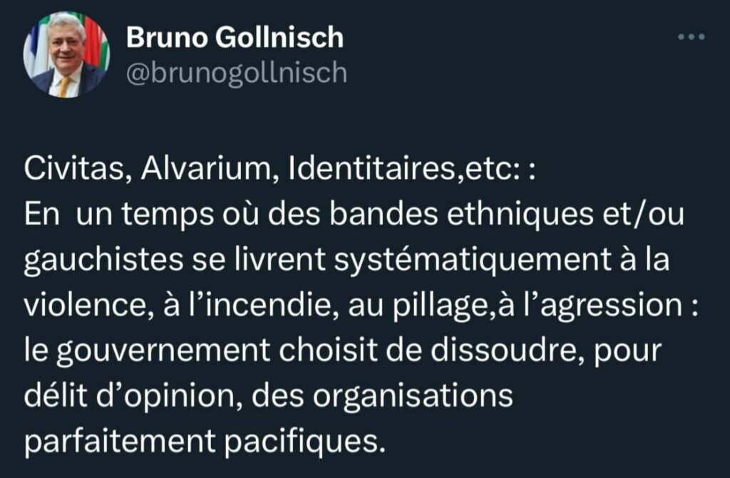 L’ancien député européen Bruno Gollnisch a réagi à l’annonce gouvernementale de dissolution de Civitas. « Civitas, Alvarium, Identitaires, etc. En un temps où des bandes ethniques et/ou gauchistes se livrent systématiquement à la violence, à l’incendie, au pillage, à l’agression ; le gouvernement choisit de dissoudre, pour délit d’opinion, des organisations parfaitement pacifiques. » Des propos de bon sens qui soulignent à quel point le gouvernement est éloigné des véritables préoccupations des Français.