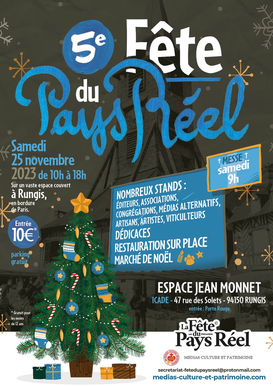 Désormais organisée par les associations La Fête du Pays Réel et Médias Culture et Patrimoine, la cinquième Fête du Pays Réel se déroulera le samedi 25 novembre et prendra la forme d’un grand marché de Noël mettant en valeur les artisans et artistes catholiques ainsi que les produits du terroir.