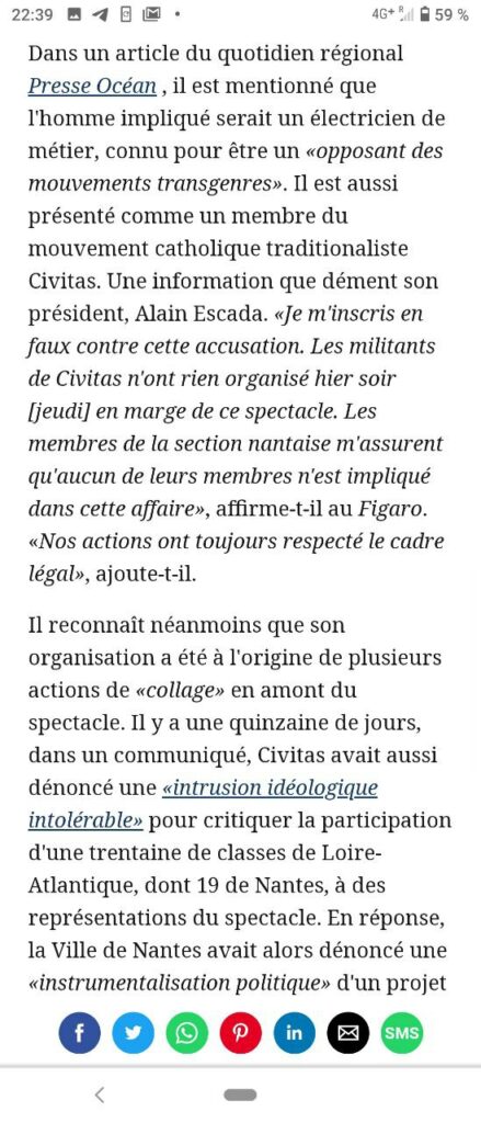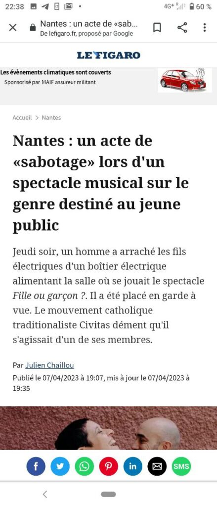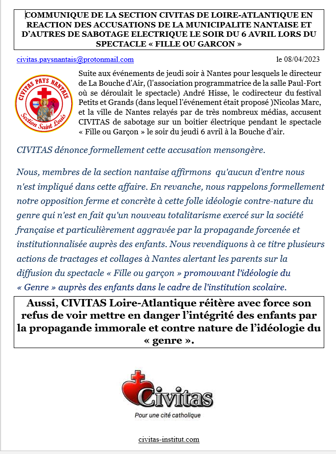 Vendredi, la majorité municipale de Nantes accusait Civitas d’un sabotage électrique lors d’une représentation du spectacle de propagande transgenre Fille ou Garçon ? Un homme a été mis en garde à vue à ce sujet. Plusieurs médias locaux ont fait preuve d’une servilité sans nom en reprenant les accusations de la majorité gauchiste de la ville de Nantes sans chercher le moins du monde à vérifier les faits ni à prendre l’avis de Civitas. Heureusement, l’Agence France Presse (AFP) et d’autres médias ont eu l’honnêteté de donner à Alain Escada, président de Civitas, l’occasion de réfuter ces accusations mensongères.