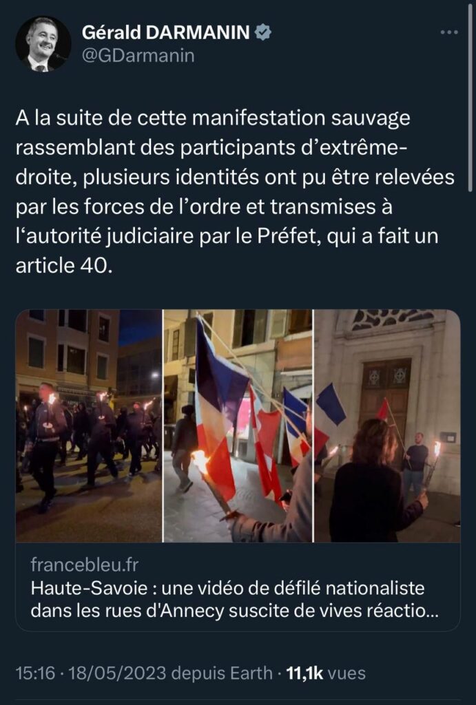 Dans la soirée du 16 mai 2023, à Annecy, une manifestation nationaliste surprise s’est tenue sans aucun incident. Il s’agissait d’un camouflet à la décision liberticide du ministre Darmanin enjoignant tous les Préfets d’interdire désormais les manifestations « d’extrême droite ».