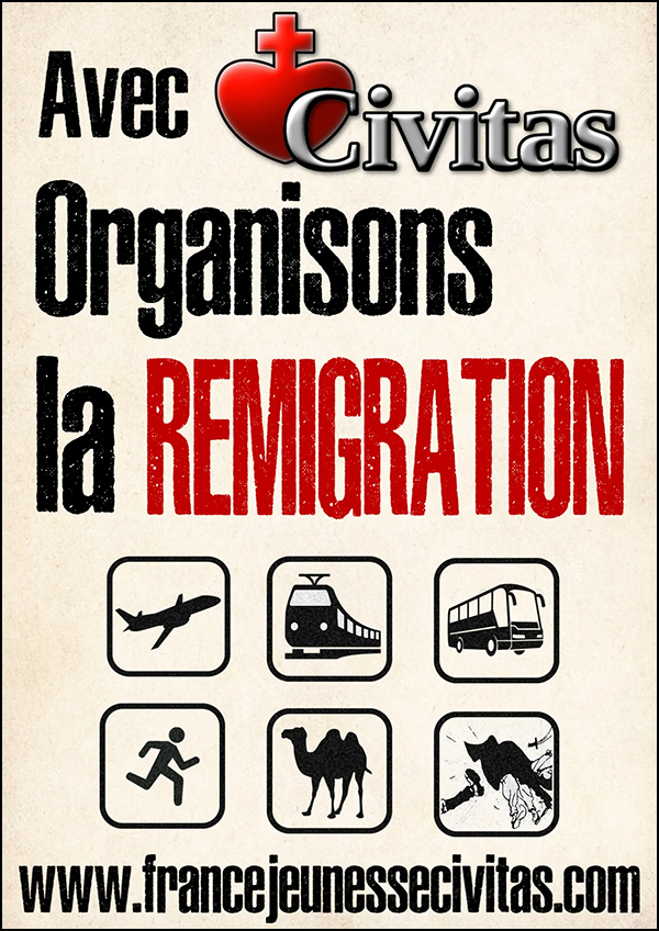 Il y a près de 15 ans déjà que Civitas, seul mouvement catholique et national, avait appelé à la REMIGRATION [Voir photo ci-dessus d’une affiche de 2012].
