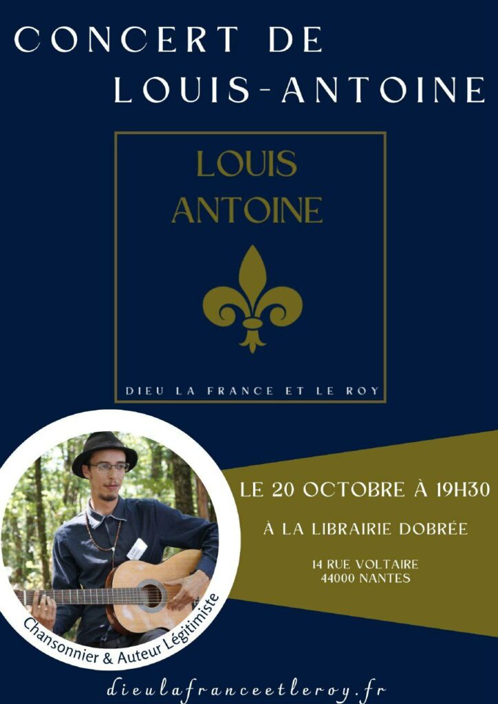 Le 20 octobre, à 19h30, le chansonnier légitimiste Louis-Antoine se produira en concert à la Librairie Dobrée, 14 rue Voltaire à Nantes.