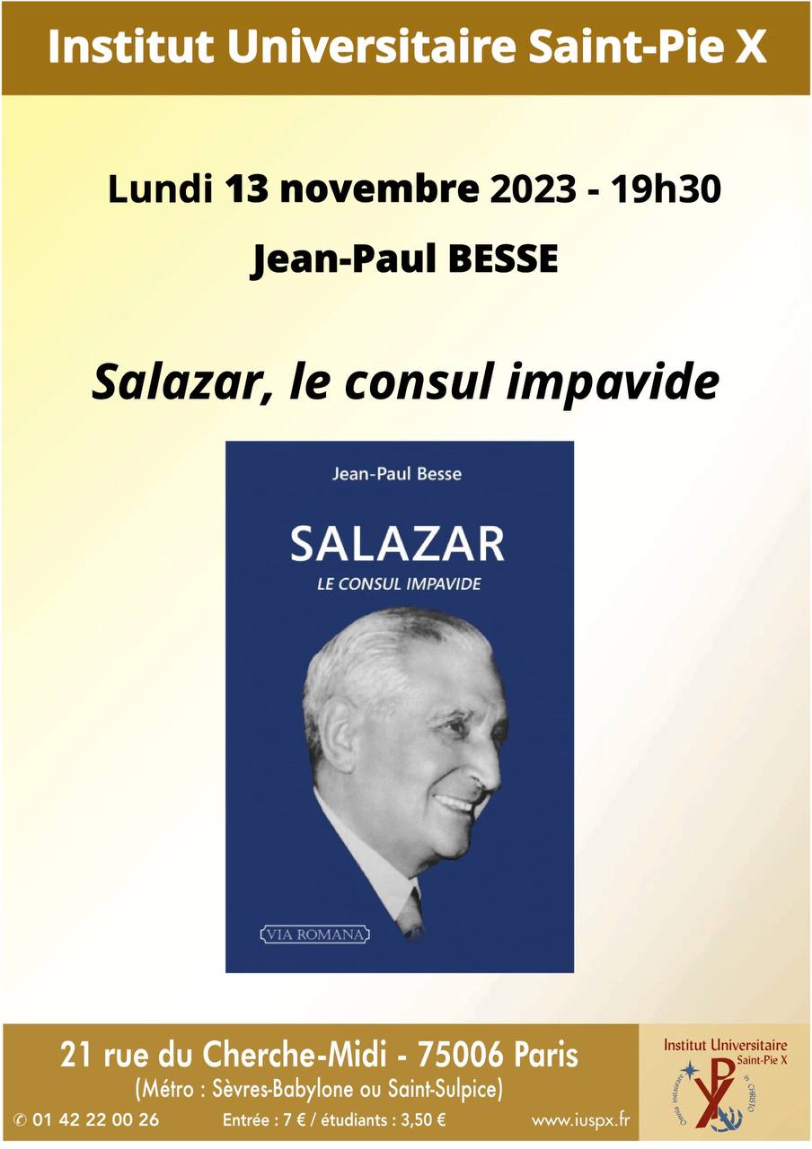 Jean-Paul Besse fera une conférence sur Salazar, le consul impavide le lundi 13 novembre 2023 à 19h30 à l’Institut Universitaire Saint Pie X, 21 rue du Cherche-Midi (75006 Paris)