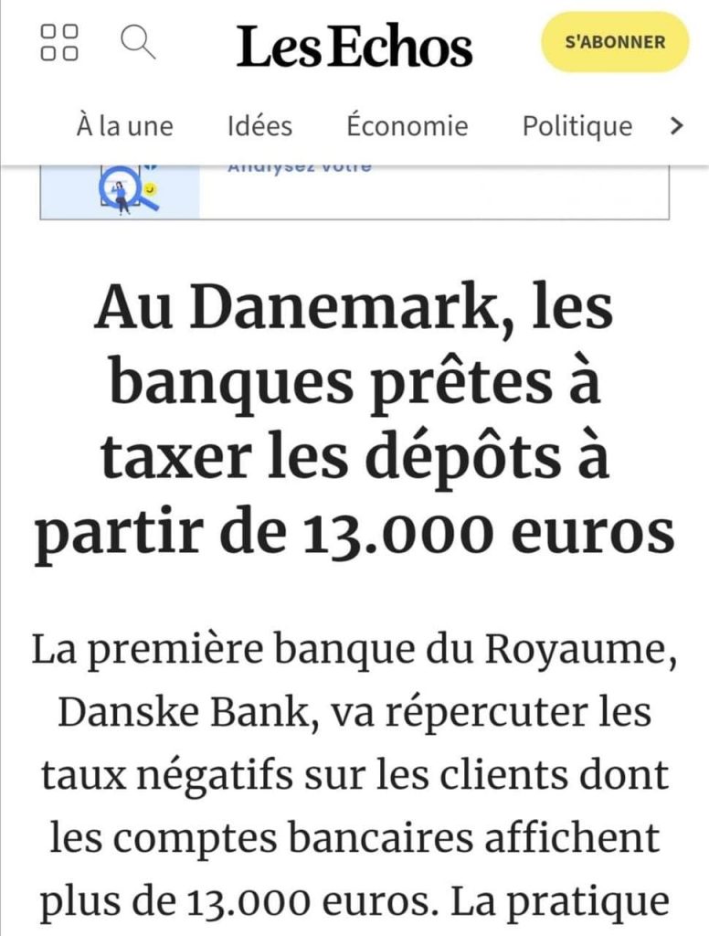 En pleine conformité avec le projet de Grand Reset de l’économie développé par Klaus Schwab, dirigeant du Forum économique mondial, la Danske Bank, première banque du Royaume danois, va pratiquer les taux négatifs sur les comptes bancaires des épargnants dès qu’ils affichent plus de 13.000 euros, comme le souligne le journal économique L’Echo.