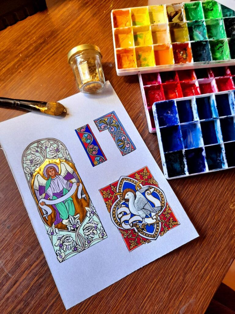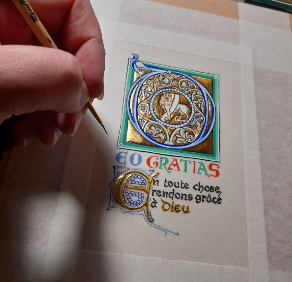 Comme les moines et les moniales de Jadis, mon métier est d’illustrer les textes les plus sacrés, les couvrant d’or et de matières précieuses. D’abord sur parchemin appelé « vélin » je viens calligraphier le texte, ensuite je pose les précieuses feuilles d’or et les couches de couleurs liées à l’oeuf… les pigments sont fabriqués avec des végétaux (ex: indigo) et des minéraux (ex : lapis lazuli).