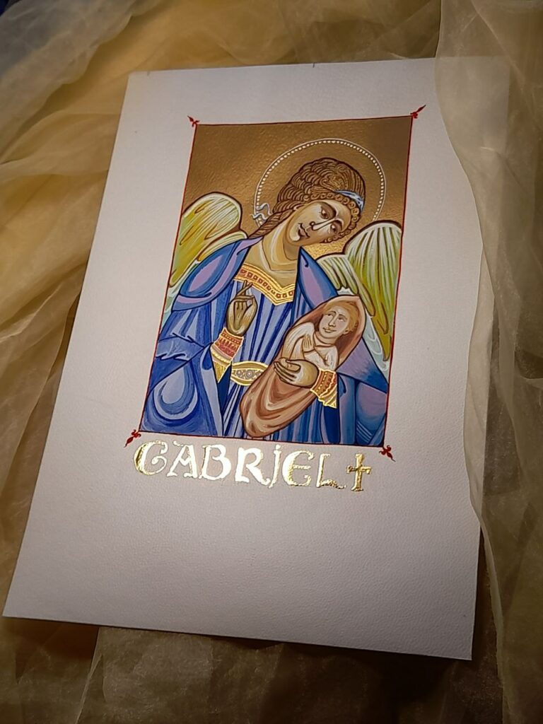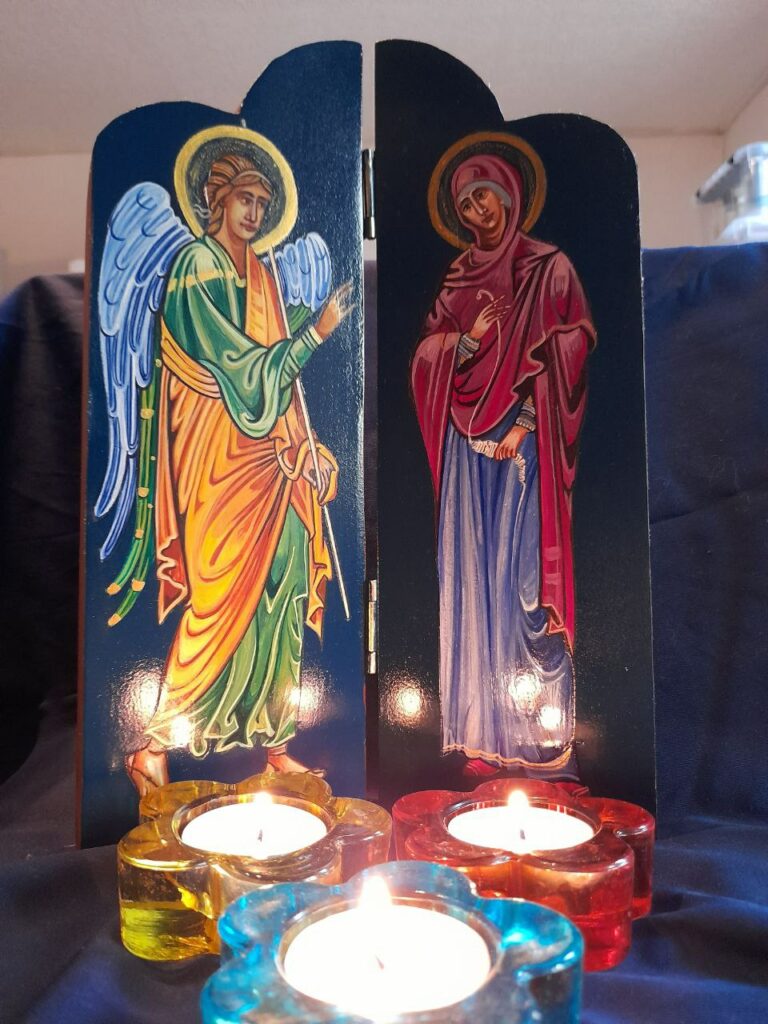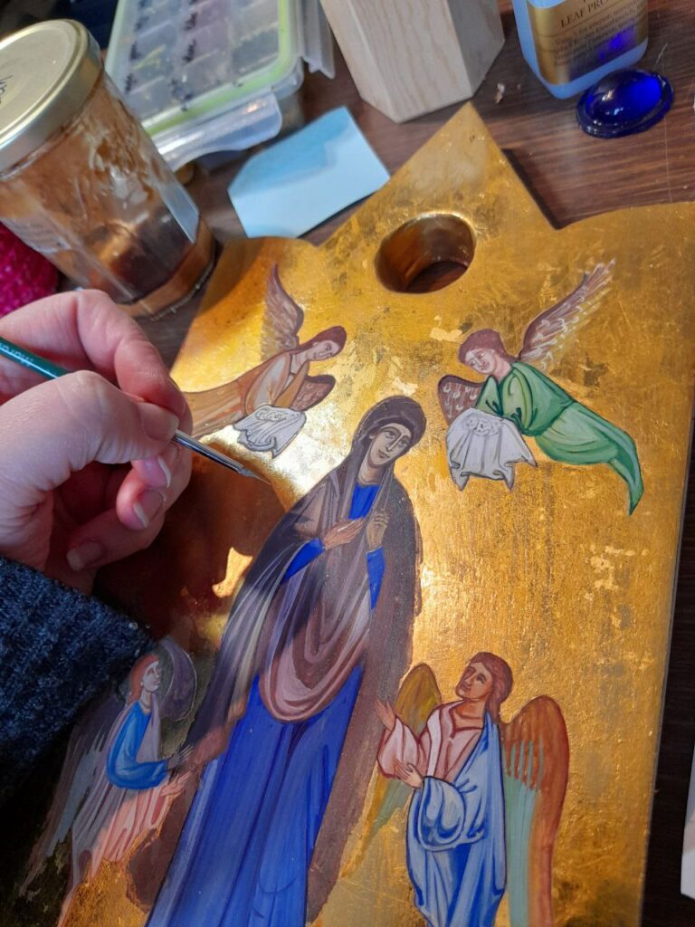 Je travaille aussi à l’ornementation de cierges pour la liturgie ainsi qu’à la peinture d’icônes.