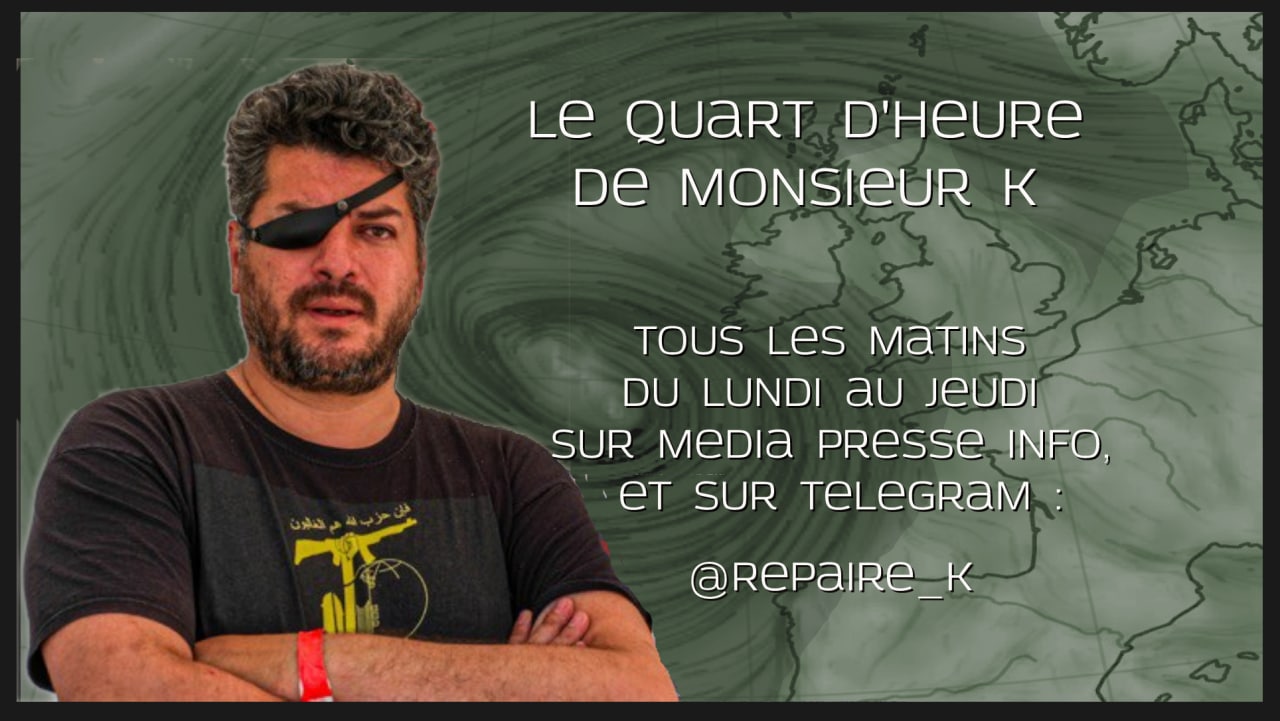 Le journaliste dissident Monsieur K revient à l’antenne ! Après avoir réalisé des émissions pour Radio Courtoisie durant 15 ans, puis pour Méridien Zéro et ERFM, il entame un partenariat avec Médias Presse Info. Vous retrouverez ici-même, tous les matins, du lundi au jeudi, la chronique décapante « Le quart d’heure de Monsieur K ».