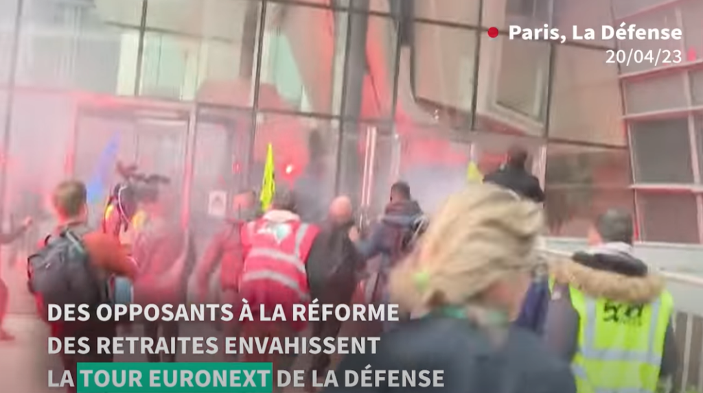La Tour Euronext, « symbole du CAC 40 » et de la bourse européenne a été envahie par des opposants à la réforme des retraites lors d’une action coup de poing dans le quartier de la Défense à Paris. Une action similaire avait déjà préalablement été menée au siège de LVMH. Le discours de Macron à la télévision n’a pas calmé la colère populaire.
