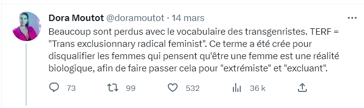 Nous vous parlions dans un article précédent de la confusion des temps qui amène la militante féministe Dora Moutot à être accusée de transphobie parce qu’elle répète qu’un transgenre n’est pas une femme. Le sujet nous amène à traiter un nouveau néologisme transgenre : le mot « terf ».