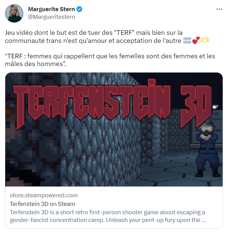 Marguerite Stern, une ex-Femen, qui comptait parmi celles qui ont attaqué la manifestation de Civitas contre la loi Taubira qui a légalisé le mariage entre personnes de même sexe, se trouve aujourd’hui accusée d’être transphobe et qualifiée de « terf »… Elle signale d’ailleurs qu’il existe un jeu vidéo pour transgenres dont le but est de tuer des « terfs ».