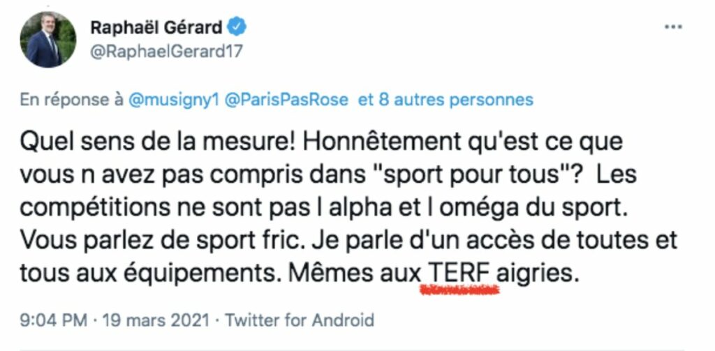 On notera que le député macroniste Raphaël Gérard, notoirement homosexuel, utilise l’expression « terf » et l’adresse à celles qui désapprouvent que des transgenres nés hommes participent à des compétitions sportives féminines et raflent les trophées destinés à des femmes.