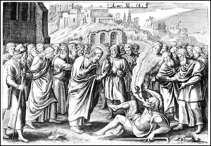 Au même lieu, la passion de saint Pierre martyr, officier de la chambre de l’empereur Dioclétien. Comme il protestait avec une grande liberté contre les supplices excessifs infligés aux martyrs, l’empereur le fit pour ce motif amener devant lui, ordonna d’abord de le suspendre en l’air, de le déchirer lentement à coups de fouet, puis de répandre sur ses plaies du sel et du vinaigre, enfin de le brûler à petit feu sur un gril: de la sorte il fut vraiment l’héritier de la foi de Pierre comme il l’était de son nom.