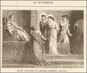 A Nicomédie, l’anniversaire des saints martyrs Cyprien, et Justine vierge. Justine, ayant beaucoup souffert pour le Christ sous l’empereur Dioclétien et le préfet Eutolme, convertit Cyprien qui, adonné à la magie, tentait par ses enchantements de la rendre folle: avec lui, elle endura dans la suite le martyre. Leurs corps furent exposés aux bêtes, mais des marins chrétiens les enlevèrent pendant la nuit et les transportèrent à Rome. Là , on les transféra plus tard dans la Basilique Constantinienne, et on les ensevelit près du baptistère.