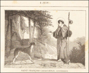 François, appelé d’abord Ascanio, naquit à Santa-Maria-de-Villa dans les Abruzzes, de la noble famille des Caracciolo. Dès ses premières années, il se fit remarquer par une vive piété. Encore adolescent, il résolut, pendant une grave maladie, de s’attacher entièrement au service de Dieu et du prochain. Il partit pour Naples, se prépara au sacerdoce, et s’étant inscrit dans une pieuse confrérie, se livra à la contemplation et à l’œuvre du salut des pécheurs ; il se dévouait aussi à exhorter les condamnés à mort. Il arriva qu’une lettre destinée à un autre lui fut remise par erreur ; lettre dont les pieux auteurs, Jean Augustin Adorno et Fabrice Caracciolo, appelaient le destinataire à fonder un nouvel institut religieux. Frappé de ce fait étrange, et admirant les desseins de la volonté divine, Ascanio se joignit à eux avec empressement. S’étant retirés dans une solitude des Camaldules, ils y arrêtèrent les règles du nouvel Ordre ; et venus à Rome, ils en obtinrent la confirmation du Pape Sixte-Quint, qui voulut qu’on les appelât Clercs réguliers mineurs. Ils ajoutèrent aux trois vœux ordinaires celui de ne point rechercher les dignités. Ascanio Caracciolo, en faisant sa profession solennelle, prit le nom de François, à cause de sa dévotion particulière à saint François d’Assise. Adorno étant mort deux ans après, François fut mis malgré lui à la tête de tout l’Ordre ; et dans cette charge, donna de très beaux exemples de toutes les vertus. Plein de sollicitude pour le développement de son Ordre, il demandait de tout son cœur à Dieu cette grâce, par des prières, des larmes et des mortifications continuelles. Dans ce but, il se rendit trois fois en Espagne vêtu en pèlerin, et mendiant sa nourriture de porte en porte. Il eut à supporter en chemin les épreuves les plus pénibles, mais ressentit d’une façon merveilleuse l’appui du Tout-Puissant : grâce à sa prière, le navire qui le portait fut préservé d’un naufrage imminent. Pour arriver à ses fins dans, ce royaume, il eut beaucoup à travailler et à souffrir ; mais ayant surmonté l’opposition de ses ennemis avec une force d’âme singulière, la renommée de sa sainteté et la munificence des rois catholiques Philippe II et Philippe III, l’aidèrent à fonder plusieurs maisons de son Ordre ; ce qu’il fit en Italie avec le même succès. François excella tellement dans l’humilité, qu’arrivé à Rome et reçu dans un hospice de pauvres, il choisit un lépreux pour compagnon, et refusa constamment les dignités ecclésiastiques que Paul V lui offrait. Il conserva toujours intacte sa virginité, et gagna même à Jésus-Christ des femmes qui avaient eu l’impudence de tendre des pièges à sa chasteté. Brûlant d’un ardent amour pour le divin mystère de l’Eucharistie, il passait des nuits presque entières en adoration devant le Saint-Sacrement et voulut que ce pieux exercice fût perpétuellement pratiqué dans son Ordre, comme en étant la marque distinctive. Il favorisa de tout son pouvoir le culte de la Vierge Mère de Dieu. Sa charité envers le prochain était des plus vives. Il eut en partage le don de prophétie et celui de scruter les cœurs. A l’âge de quarante-quatre ans, se trouvant un jour en prière dans la sainte maison de Lorette, il eut connaissance de sa fin prochaine et se dirigea aussitôt vers les Abruzzes ; arrivé dans le bourg d’Agnoni, il fut pris d’une fièvre mortelle, chez les disciples de saint Philippe de Néri. Après avoir reçu avec une très grande dévotion les sacrements de l’Église, il s’endormit paisiblement dans le Seigneur, la veille des nones de juin de l’an mil six cent huit, en la vigile de la fête du Corps du Christ. Sa sainte dépouille fut transportée à Naples, et inhumée avec honneur dans l’église de Sainte-Marie-Majeure, où il avait jeté les premiers fondements de son Ordre. Plus tard, l’éclat de ses miracles détermina le souverain Pontife Clément XIV à l’inscrire solennellement au nombre des Bienheureux. De nouveaux prodiges ayant éclaté, Pie VII le mit au nombre des Saints en mil huit cent sept.