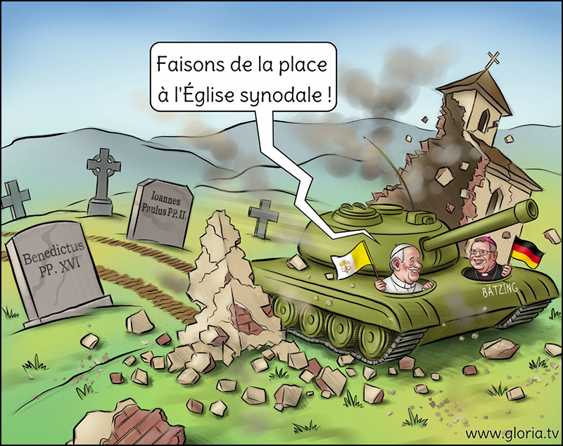 Bien sûr, on peut organiser la célébration clandestine de la Messe Catholique, mais que peut faire un prêtre ou un laïc quand une coupole subversive d’évêques manœuvrés par Bergoglio se prépare à introduire avec le Synode sur la Synodalité des changements doctrinaux inacceptables ? Et que pourront-ils faire lorsque, dans leurs paroisses, une diaconesse bénira le « mariage » de deux sodomites ?