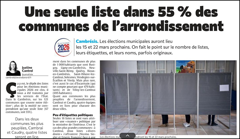 Les listes des candidats aux municipales de mars 2026 sont à présent toutes déposées. Et dans le Cambrésis, c’est la douche froide pour tous les partis. Très peu de listes partisanes mais surtout, très peu de pluralisme. Comme si les habitants désabusés, désillusionnés, se détournaient de la vie publique.