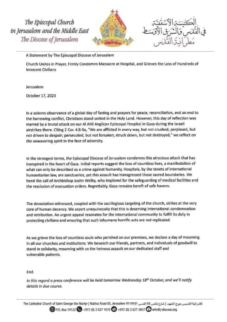 Cependant, l’Église épiscopale de Jérusalem, dont dépend l’hôpital, a officiellement accusé Israël de l’avoir attaqué. Dans un communiqué du 17 octobre, elle a déclaré que la partie israélienne avait averti l’hôpital à trois reprises de l’attaque imminente.