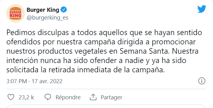 « Nous nous excusons auprès de tous ceux qui se sont sentis offensés par notre campagne visant à promouvoir nos produits végétaux pendant la Semaine Sainte. Notre intention n’a jamais été d’offenser qui que ce soit et le retrait immédiat de la campagne a déjà été demandé », a tweeté Burger King.