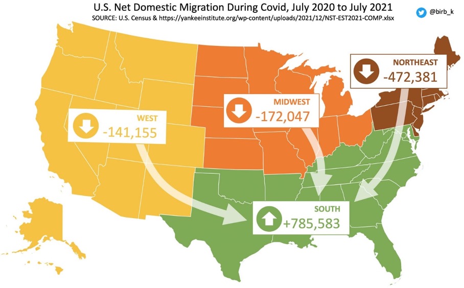 Le Bureau du recensement des États-Unis estime que la Californie a perdu 1% de sa population en 2021, soit environ 367,299 résidents. Elle est suivie par l’État de New-York qui a vu 319,000 de ses habitants partir. Ce sont les États conservateurs du sud qui récoltent cette immigration qualifiée fuyant principalement le covidisme et la fiscalité affolante de ces États d’extrême gauche.