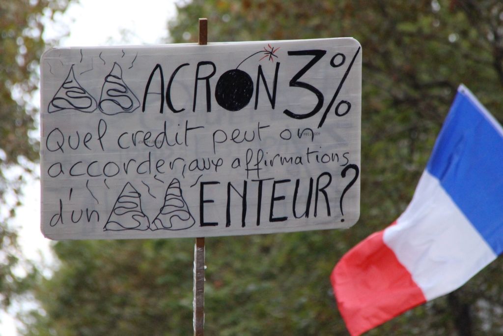 Les mensonges, contradictions et revirements continuels d’Emmanuel Macron ainsi que ceux de ses principaux ministres ont fleuri sur les pancartes lors du défilé.