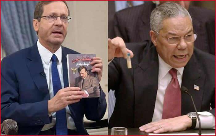 « Accréditer les impulsions nazies auprès des ennemis est une nécessité qui a été plutôt galvaudée dans les guerres occidentales, de Saddam à Kadhafi, d’Assad à Poutine, la déshumanisation hitlérienne a touché presque tout le monde. Dans ce cas précis, le coup n’est pas sans rappeler la fiole d’anthrax brandie par Colin Powell à l’ONU pour légitimer l’invasion de l’Irak.