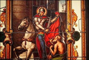 Martin, né à Sabarie en Pannonie, s’enfuit à l’église, malgré ses parents, quand il eut atteint sa dixième année, et se fit inscrire au nombre des catéchumènes. Enrôlé à quinze ans dans les armées romaines, il servit d’abord sous Constantin, puis sous Julien. Tandis qu’il n’avait pas autre chose que ses armes et le vêtement dont il était couvert, un pauvre lui demanda, près d’Amiens, l’aumône au nom du Christ, et Martin lui donna une partie de sa chlamyde. La nuit suivante, le Christ lui apparut revêtu de cette moitié de manteau, faisant entendre ces paroles : « Martin, simple catéchumène, m’a couvert de ce vêtement. » A l’âge de dix-huit ans, il reçut le baptême. Aussi, ayant abandonné la vie militaire, se rendit-il auprès d’Hilaire, Évêque de Poitiers, qui le mit au nombre des Acolytes. Devenu plus tard Évêque de Tours, Martin bâtit un monastère, où il vécut quelque ; temps de la manière la plus sainte, avec quatre-vingts moines. Étant tombé gravement malade de la fièvre, à Candes, bourg de son diocèse, il priait instamment Dieu de le délivrer de la prison de ce corps mortel. Ses disciples qui l’écoutaient, lui dirent : « Père, pourquoi nous quitter ? à qui abandonnez-vous vos pauvres enfants ? » Et Martin, touché de leurs accents, priait Dieu ainsi : « O Seigneur, si je suis encore nécessaire à votre peuple, je ne refuse point le travail. » Ses disciples voyant que, malgré la force de la fièvre, il restait couché sur le dos et ne cessait de prier, le supplièrent de prendre une autre position, et de se reposer en s’inclinant un peu, jusqu’à ce que la violence du mal diminuât. Mais Martin leur dit : « Laissez-moi regarder le ciel plutôt que la terre, pour que mon âme, sur le point d’aller au Seigneur, soit déjà dirigée vers la route qu’elle doit prendre. » La mort étant proche, il vit l’ennemi du genre humain et lui dit : « Que fais-tu là, bête cruelle ? esprit du mal, tu ne trouveras rien en moi qui t’appartienne. » Et, en prononçant ces paroles, le Saint rendit son âme à Dieu, étant âgé de quatre-vingt-un ans. Une troupe d’Anges le reçut au ciel, et plusieurs personnes, entre autres saint Séverin, Évêque de Cologne, les entendirent chanter les louanges de Dieu.