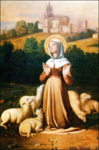 Germaine Cousin naquit à Pribrac, non loin de Toulouse. Sa courte vie de vingt-deux ans est une merveille de la grâce. Fille d’un pauvre laboureur, percluse de la main droite, scrofuleuse, elle fut, pour comble de malheur, privée de sa mère, à peine sortie du berceau. La petite orpheline devint l’objet de la haine et du mépris d’une belle-mère acariâtre et sans coeur; la douleur, née avec elle, devait être sa compagne jusqu’à la mort. Cette pauvre ignorante fut instruite par Dieu même dans la science de la prière. Bergère des troupeaux de la famille, elle passait son temps en conversations avec le Ciel; le chapelet était son seul livre; la Sainte Vierge était sa Mère, les Anges ses amis, l’Eucharistie sa vie. Souvent on la vit agenouillée dans la neige, traversant à pied sec le ruisseau voisin sans se mouiller, pour se rendre à l’église, où elle assistait chaque jour au Saint Sacrifice et communiait souvent, pendant que ses brebis paissaient tranquilles autour de sa quenouille plantée en terre. Charitable pour les pauvres, elle leur donnait son pauvre pain noir, ne vivant guère que de l’amour de Dieu; et, un jour, le Ciel renouvela pour elle le miracle des roses devant les yeux de son impitoyable marâtre. A sa mort, les Anges et les Vierges célestes chantèrent au-dessus de sa maison. Quarante ans plus tard, on trouva, comme par hasard, mais providentiellement, son corps intact avec un bouquet de fleurs fraîches, sous les dalles de l’église de sa paroisse. Elle est devenue une des grandes Thaumaturges et une des Saintes les plus populaires de la France.