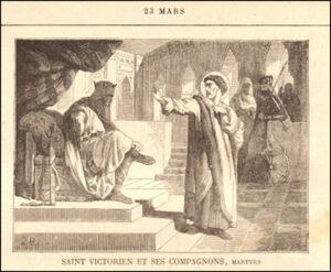 Victorien, natif d’Adrumète, en Afrique, était proconsul de Carthage. Le roi, nommé Hunéric, homme barbare, employa tous ses efforts pour le détourner de la religion et lui fit les plus magnifiques promesses; mais il reçut cette réponse simple et ferme:  « Rien ne sera capable de me séparer de la foi et de l’amour de Jésus-Christ. Vous pouvez m’exposer aux flammes, me jeter aux bêtes, me soumettre à toutes sortes de supplices, jamais je ne trahirai la vraie foi; ce serait de ma part une ingratitude, une perfidie; n’eussé-je pas à craindre les châtiments éternels, ni à espérer une récompense sans fin, je ne saurais manquer de fidélité à mon Dieu. » Le tyran, irrité, lui inflige tous les tourments que peut lui suggérer sa rage: Victorien les endure avec joie et constance et va recevoir au Ciel la couronne conquise au prix de son sang. Plusieurs autres chrétiens furent aussi les victimes de ce tyran cruel: parmi eux, deux frères qui s’étaient promis par serment de mourir l’un avec l’autre et d’un même supplice. Dieu permit en effet qu’ils obtinssent de leurs bourreaux la grâce touchante qu’ils avaient désirée. On commença par les suspendre avec de gros poids attachés à leurs pieds. Au bout d’un jour passé dans cette douloureuse situation, l’un d’eux, succombant à la douleur, demanda quelque répit. Son frère, craignant qu’il n’eût la faiblesse de renoncer à sa foi, lui cria du haut de sa potence: « Gardez-vous bien de faiblir, mon frère; est-ce là ce que nous avons promis ensemble à Jésus-Christ? Si vous trahissez votre foi et votre serment, je serai moi-même votre accusateur au tribunal de Dieu. » Le pauvre martyr chancelant reprit alors courage et s’écria d’une voix forte: « Ajoutez les supplices aux supplices, je suis prêt à souffrir tout ce que souffrira mon frère. » Les bourreaux emploient alors contre ces deux héroïques martyrs les lames de fer rougies au feu, les ongles de fer et d’autres tortures non moins affreuses. Chose étonnante, on ne voyait sur eux aucune meurtrissure ni aucune trace des tourments qu’on leur faisait endurer. A la fin, voyant que le courage des martyrs et les merveilles que Dieu opérait en leur faveur semblaient fortifier dans la foi ou convertir ceux qui en étaient les témoins, les bourreaux se hâtèrent d’achever leurs victimes, et les deux frères allèrent recevoir, avec Victorien, la palme due aux généreux soldats du Christ.