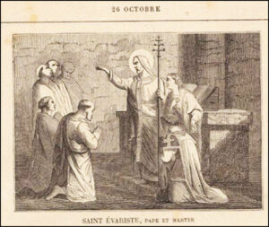 Grec de naissance, saint Evariste était cependant d’origine juive. On ignore à quelle époque il embrassa la foi et comment il vint à Rome, mais on sait qu’étant devenu prêtre, il édifia grandement les fidèles par ses exemples, sa charité et ses instructions. Après le martyre du saint pape Anaclet, alors que la seconde persécution générale sévissait avec la plus grande fureur, saint Evariste fut élu pape d’une voix unanime. Ce véritable Père de la chrétienté mit tous ses soins à pourvoir aux besoins de l’Église dans un temps où elle était persécutée par les païens et déchirée par les hérétiques des diverses sectes de Gnostiques qui infestaient alors le christianisme. Le souverain pontife veilla si bien à la garde de son troupeau que les fidèles de Rome conservèrent toujours la pureté de la foi et que le poison de l’hérésie ne put jamais gagner ni le coeur ni l’esprit des chrétiens romains. Évariste ne se reposait pas uniquement sur les prêtres de Rome pour distribuer la parole de Dieu, mais il prêchait souvent lui-même et visitait les différentes paroisses de la ville avec un zèle infatigable. La persécution de Trajan, regardée comme la troisième dans l’histoire de l’Église, commença sous le pontificat du saint pape Evariste. Cet empereur impie éprouvait une aversion mortelle pour les chrétiens qu’il persécuta pendant les neuf dernières années de son règne. Pour venir plus facilement à bout du troupeau, ce tyran s’attaqua au pasteur suprême. Saisi et jeté en prison, saint Evariste fit éclater si fortement sa joie de souffrir pour Jésus-Christ que les magistrats en étaient interdits et stupéfaits. Cet admirable souverain pontife endura le martyre en même temps que l’illustre évêque d’Antioche, saint Ignace. L’héroïque et glorieuse confession de ces deux grands Saints, unit les Églises d’Orient et d’Occident dans une même profession de foi. Le corps de saint Evariste est enterré au Vatican, près du tombeau de saint Pierre.