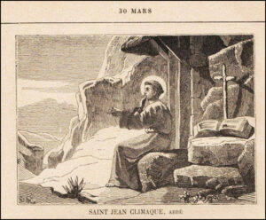 Le nom de ce Saint lui vient du beau livre qu’il composa sous le titre grec de Climax ou Échelle du Ciel. La Palestine fut son premier séjour. A seize ans, il quitta le monde pour se donner entièrement à Dieu dans un monastère du mont Sinaï. A dix-neuf ans, le jeune moine, sous la conduite d’un saint religieux nommé Martyrius, travailla sans relâche à sa perfection et y fit des progrès si rapides qu’ils étonnaient son maître lui-même. A la mort de son maître, Jean se retira dans une solitude profonde, afin d’y mener une vie plus parfaite encore. Une croix de bois, une table formée de quatre planches grossières et le livre des Saintes Écritures, avec quelques ouvrages des saints Pères, en faisaient tout l’ameublement. C’est là qu’il vécut quarante ans, de la vie d’un ange plutôt que de la vie d’un homme. Détaché du monde, affranchi pour ainsi dire du corps par la mortification, il s’élevait librement jusqu’à Dieu, s’abîmait en des contemplations sublimes et s’entretenant suavement avec les anges des mystères de la foi. Ses deux yeux étaient deux fontaines de douces larmes qu’il versait dans le secret de la solitude. Il eût voulu noyer dans ses pleurs tous les crimes de la terre; il gémissait aussi sur son trop long exil et soupirait après la Patrie céleste; mais le plus souvent ses larmes étaient des larmes de joie, d’admiration et de débordant amour, excitées par la contemplation des merveilles divines qui lui étaient révélées. Est-il étonnant que, nouveau Jean-Baptiste, il vît les foules accourir à lui pour recevoir les leçons de la pénitence et de la vie chrétienne? A chacun il traçait des règles salutaires; sa bénédiction guérissait les malades, fortifiait les faibles, consolait les affligés, touchait les obstinés et les convertissait plus que les raisonnements de la science. Grande était la puissance de Jean Climaque contre le démon; il sut le vaincre et le décourager dans les combats qu’il eut à subir de sa part; il fut terrible aussi à l’ennemi du salut en le chassant de l’âme de ses frères. Un solitaire nommé Isaac, vint se jeter à ses pieds, le suppliant de le délivrer des obsessions impures dont le démon le pressait sans relâche: « La paix soit avec vous, mon frère! » dit le Saint. A ces mots, il se mit avec lui en prière. Le visage du Saint devint resplendissant d’une clarté céleste qui se répandait dans la grotte, et le démon poussait d’affreux rugissements. La prière terminée, Isaac se releva paisible et délivré pour toujours. Jean Climaque fut élu, à soixante-quinze ans, abbé du Sinaï, et devint de plus en plus l’ange et l’oracle du désert jusqu’à sa mort.