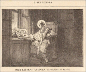 Laurent, né à Venise de l’illustre famille des Justinien, montra dès son enfance une très grande gravité de mœurs. Les pratiques d’une piété fervente sanctifièrent son adolescence, et l’appel de la Sagesse divine ayant convié son âme aux chastes fiançailles du Christ, il s’appliqua à connaître dans quel institut religieux il se consacrerait à Dieu. Voulant donc se préparer en secret à cette nouvelle milice, il se mit, entre autres mortifications, à coucher sur des planches nues. Un jour qu’il considérait, d’une part les plaisirs du monde et une alliance négociée par sa mère à son intention, et d’autre part les rudes austérités du cloître, il jeta les yeux sur la croix du Christ souffrant et s’écria : « C’est vous, Seigneur, qui êtes mon espérance, et c’est en vous que se trouve la consolation et la force. » Laurent dirigea ses pas vers la communauté des Chanoines de Saint-Georges in Alga, où, ingénieux à trouver de nouveaux moyens de se mortifier, il engagea contre lui-même le plus opiniâtre des combats, comme s’il se fût agi de son ennemi le plus redoutable. Ne s’accordant aucune satisfaction, il s’interdit même l’entrée du jardin de la maison paternelle, et ne franchit jamais le seuil de cette demeure, si ce n’est pour remplir auprès de sa mère mourante les derniers devoirs de la piété, ce qu’il fit sans verser de larmes. Égal à son esprit de pénitence se montrait son zèle pour la pratique de l’obéissance, de la douceur et surtout de l’humilité, qui lui faisait rechercher les emplois les plus abjects du monastère, mendier dans les endroits les plus fréquentés de la ville, en y recueillant moins de vivres que de moqueries, et supporter, impassible et silencieux, les injures ainsi que les calomnies. C’était principalement dans une oraison assidue, où souvent l’extase le ravissait en Dieu, que s’enflammait la grande ardeur dont son cœur brûlait, ardeur telle qu’elle excitait à la persévérance les frères chancelants et les embrasait d’amour pour Jésus-Christ. Désigné par Eugène IV pour occuper le siège épiscopal de Venise, Laurent fit tous ses efforts pour décliner cette dignité, dont il remplit les devoirs d’une manière digne des plus grands éloges. Il ne changea absolument rien à son genre de vie accoutumé ; conserva dans ses repas, ses meubles et son coucher, la même pauvreté qu’il avait toujours pratiquée et ne prit qu’un petit nombre de domestiques, disant qu’il possédait une grande famille, les pauvres du Christ. A quelque heure du jour qu’on l’abordât, il était tout à tous, prodiguant à chacun sa charité paternelle et n’hésitant même pas à se charger de dettes pour venir en aide à l’indigence du prochain. Quand on lui demandait sur quoi il comptait : « Sur mon Seigneur, qui pourra facilement acquitter mes dettes, répondait-il. » Sa confiance n’avait jamais été trompée par la divine Providence, comme le montraient les secours inespérés qui lui arrivaient. Il construisit plusieurs monastères de vierges, qu’il forma par sa vigilance à la pratique de la vie parfaite, s’appliqua avec grand soin à arracher les dames aux pompes du siècle et à la vanité des parures, et n’apporta pas moins d’ardeur à la réforme de la discipline et des mœurs dans le clergé, se montrant digne assurément d’être proclamé par le Pape Eugène III, devant les Cardinaux, la gloire et l’honneur de l’épiscopat, et d’être nommé par Nicolas V, son successeur, le premier Patriarche de Venise, quand ce titre eut été transféré de Grado dans cette cité. Favorisé du don des larmes, Laurent offrait chaque jour au Dieu tout-puissant l’hostie de propitiation. Une fois même, la nuit de la Nativité du Seigneur, en accomplissant les saints Mystères, il mérita de contempler Jésus-Christ sous la forme d’un gracieux petit enfant. Si grande était l’efficacité de ses prières pour le troupeau confié à ses soins, que la République devait son salut à l’intercession et au mérite de son Pontife, d’après un témoignage qu’en a rendu le ciel. Doué de l’esprit prophétique, il prédit plusieurs fois des événements qu’on ne pouvait humainement prévoir. Ses prières eurent souvent pour effet de guérir les malades et de chasser les démons. Il composa des ouvrages remplis d’une doctrine toute céleste et respirant la piété, bien qu’il sût à peine les règles du style. Enfin une maladie mortelle étant venue l’atteindre, comme ses domestiques lui préparaient un lit plus commode pour un vieillard et pour un malade, il refusa des soulagements qui lui semblaient trop contraster avec la très dure croix sur laquelle avait expiré son Seigneur, et voulut qu’on le déposât sur sa couche habituelle. Puis voyant sa fin approcher, il leva les yeux au ciel, et dit ces paroles : « Je vais à vous, ô bon Jésus. » Et le huitième jour du mois de janvier, il s’endormit dans le Seigneur. Sa mort fut précieuse devant Dieu. Ce qui le prouve ce sont les concerts angéliques entendus par des religieux Chartreux ; c’est aussi la conservation de son saint corps, qui demeura dans toute son intégrité et sans trace de corruption, exhalant une odeur suave, conservant un visage vermeil, durant plus de deux mois qu’il resta sans sépulture ; ce sont enfin les nouveaux miracles qui suivirent cette mort. En considération de ces prodiges, le souverain Pontife Alexandre VIII l’inscrivit au nombre des Saints, et Innocent XII fixa la célébration de sa Fête au cinq septembre, jour où le Saint était monté sur la chaire épiscopale.
