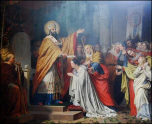 Saint Médard, l’un des plus célèbres pontifes de l’Église de France au VIer siècle, naquit vers l’an 457, à Salency, en Picardie, de parents profondément chrétiens. Dieu les bénit en leur donnant pour fils deux futurs saints évêques, Médard et Gildard. La jeunesse de Médard fut remarquable par sa grande compassion pour les pauvres et les malheureux; il s’assujettissait à des jeûnes rigoureux, afin de leur distribuer sa nourriture. Un jour, il rencontra un mendiant aveugle qui était presque nu; il se dépouilla de son habit pour l’en revêtir; et comme on lui demandait ce qu’il en avait fait, il dut répondre qu’il l’avait donné à un pauvre aveugle dont la misère l’avait touché. Un autre jour, son père, revenant de la campagne avec un grand nombre de chevaux, le chargea de les conduire dans un pré et de les y garder en attendant l’arrivée de ses domestiques. Tout à coup Médard aperçut un villageois chargé de harnais qu’il portait à grand-peine: « Eh! mon ami, lui dit l’enfant, pourquoi vous chargez-vous d’un si pesant fardeau? — C’est, répondit le paysan, que mon cheval vient de périr par accident; j’emporte ses harnais, mais sans espoir de pouvoir acquérir un autre cheval. » L’enfant, ému de compassion, prit un des chevaux confiés à sa garde et le força de l’emmener. Le Ciel témoigna par un prodige combien cet acte de charité Lui était agréable; car, après que Médard eu rendu compte à son père de son action, on trouva le nombre des chevaux complet. De plus, tous les gens de la maison virent un aigle couvrir Médard de ses ailes pendant une grosse pluie qui était tout à coup survenue. La vie de l’étudiant et du prêtre répondit à de si admirables commencements; toutes les oeuvres de zèle auxquelles peut se livrer un ministre des âmes lui étaient connues et familières. En 530, il fut élu évêque et sacré par saint Rémi. La dignité épiscopale ne lui fit rien retrancher de ses pénitences. On vit ce saint vieillard, à l’âge de soixante-douze ans, parcourir les villages, les bourgs et les hameaux, prêchant, consolant son peuple, administrant les sacrements avec un zèle infatigable. Il étendit le règne de la foi en quelques parties de son diocèse demeurées païennes; et, par ses travaux comme par ses miracles, il eut la douce joie de sauver un grand nombre d’âmes. C’est de sa main que la reine Radegonde reçut le voile de religieuse. Enfin Médard, âgé de quatre-vingt-sept ans, plus chargé encore de vertus et de mérites que d’années, rendit son âme au Créateur, en l’an 545.